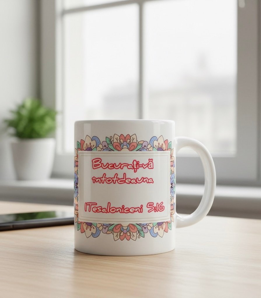 Perfectă pentru cafea, ceai sau ciocolată caldă, cana personalizată cu text creștin este ideală pentru acasă, birou sau ca dar special pentru familie și prieteni.